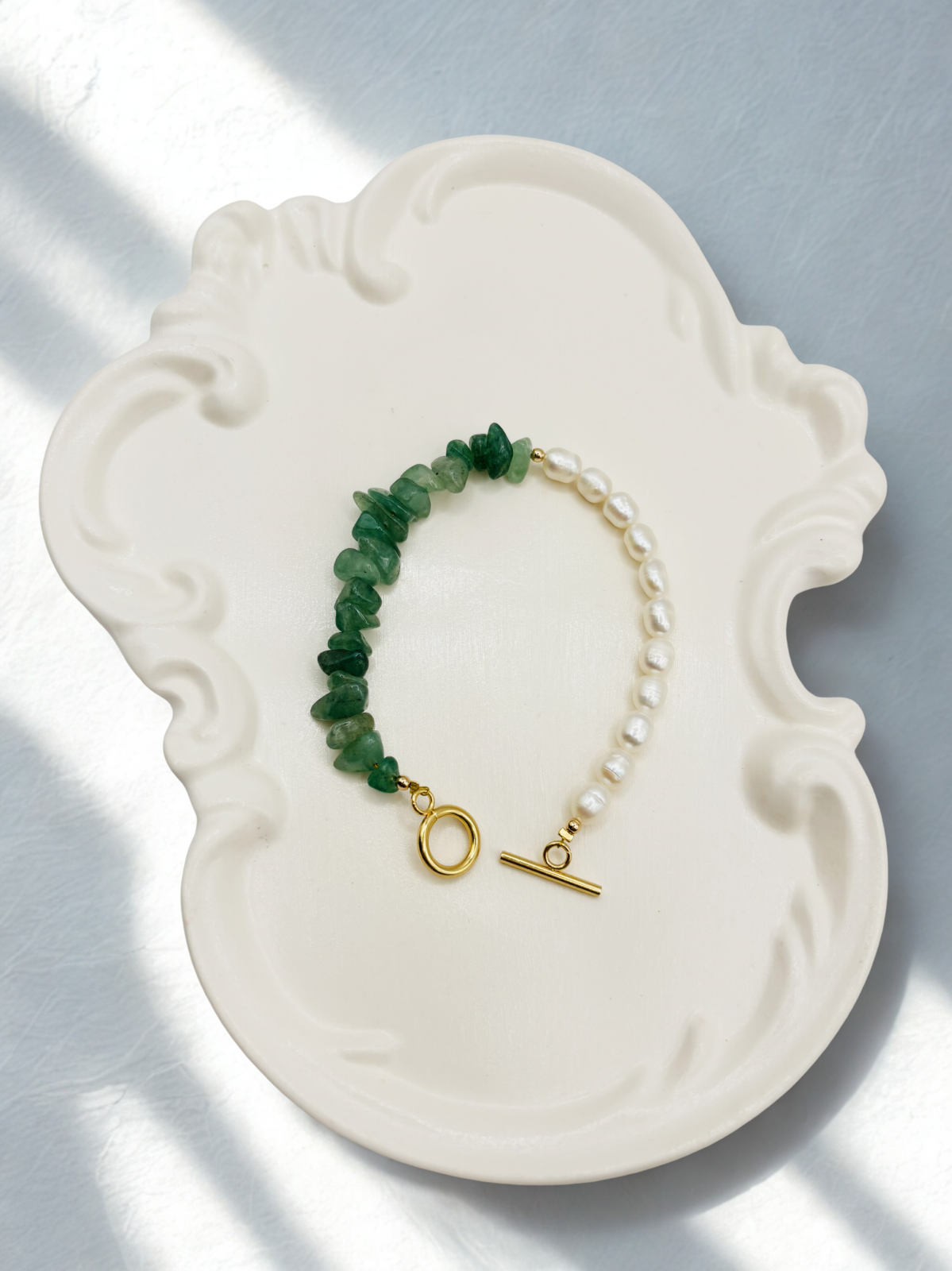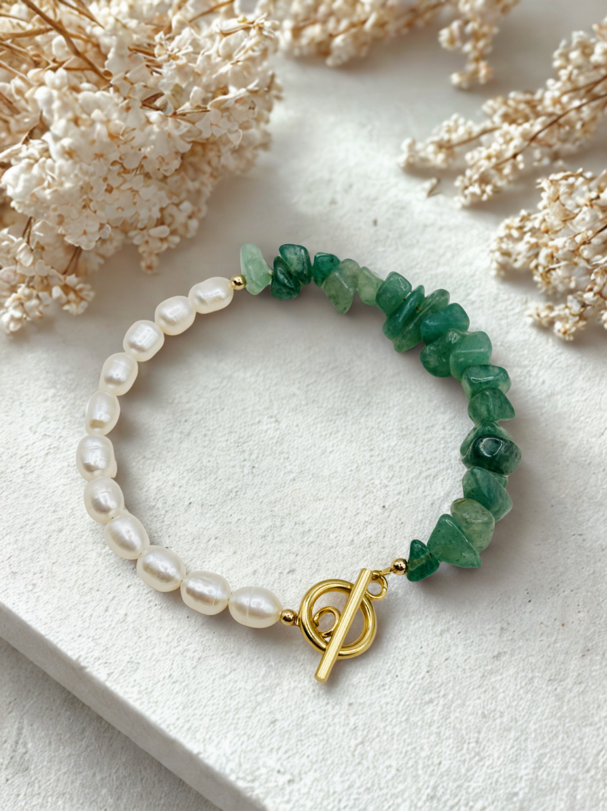 O bijuterie fină și echilibrată, creată pentru femeile care iubesc detaliile naturale și designul modern. Brățara „Green Harmony” îmbină eleganța atemporală a perlelor de cultură de 6 mm cu energia vibrantă a pietrelor de aventurin, cunoscute pentru nuanțele lor verzi bogate și formele organice.